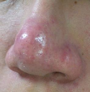 皮损主要分布在鼻部、面颊部、眉间及颏部。起病初期,鼻、颊处出现红斑,范围较小,以后出现丘疹,毛细血管扩张,呈蛛网状,纵横交错。重者可发展成鼻赘。