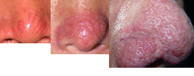 三、鼻赘期:少数患者会有,并且多发于男性。患者鼻尖部的皮脂腺和结缔组织增殖,棘层细胞轻度增厚,真皮胶原纤维增生,皮脂腺大小及数目均增加,形成紫红色结节状或肿瘤状突起,鼻尖部肥大,鼻子表面凹凸不平,毛细血管扩张,毛囊口扩张并充满角蛋白物质。